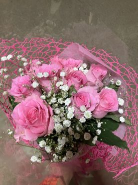 ピンクバラとカスミソウの花束を