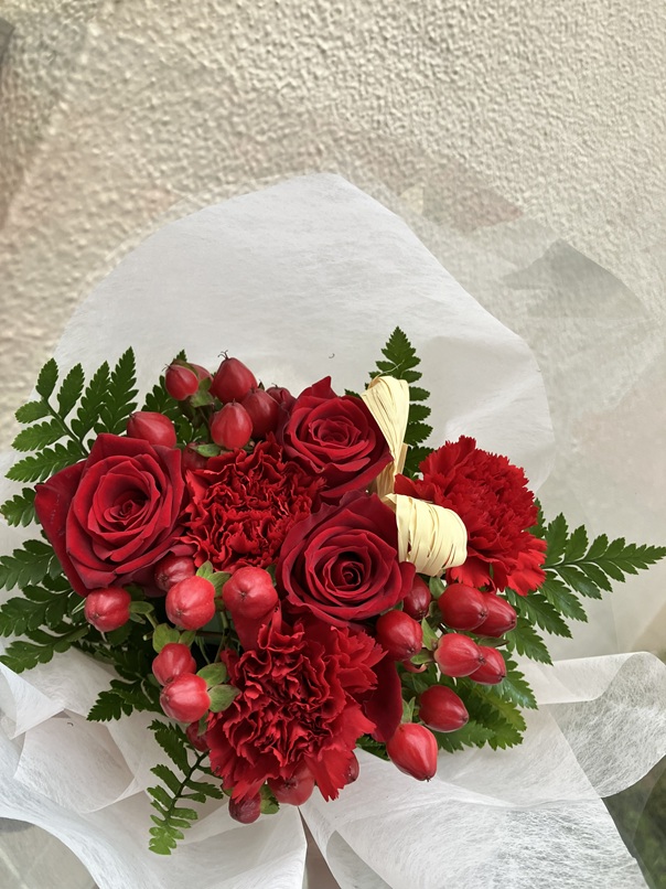 赤バラの花束を