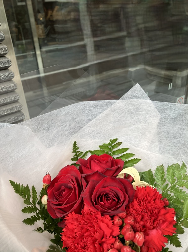 赤バラの花束を